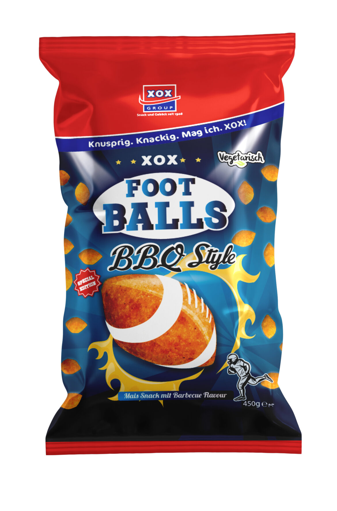 Perfect for the sporting event of the year XOX brings the perfect snack to the market: XOX Footballs in two delicious flavors and a real authentic football shape. The delicious BBQ-Style is the perfect taste experience for every barbecue fan. In its party format, it is perfect for a convivial Super Bowl evening among friends.