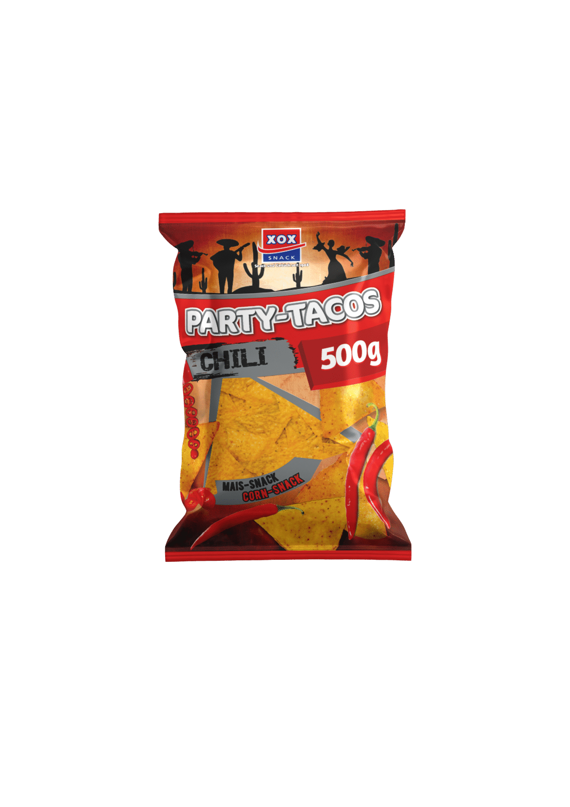 XOX Party Tacos Chili 500g bringen Feuer in jede Party! Mit ihrer pikanten Chili-Würzung sind sie die perfekte Wahl für alle, die es würzig und scharf mögen. Die typisch handliche Taco-Form lädt dazu ein, die knusprigen Tacos als abwechslungsreiche Knabberei mit einem leckeren Dip oder als feurigen Snack zwischendurch zu genießen. Tacos und Dips gehören einfach zusammen – daher bietet XOX auch die passenden XOX Dips an.